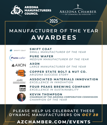 Join us for our 2025 Manufacturer of the Year Awards Luncheon! Our awards luncheon recognizes dynamic leaders from Arizona's manufacturing community with the following awards: