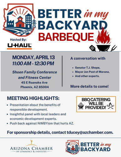 Join us for a Better in My Backyard Barbeque on Monday, April 13th for a conversation discussing the benefits of responsible development and protecting local-decision making. This important and timely conversation will be led by Senator TJ Shope, the Mayor of Marana, and other panelists that will soon be announced!